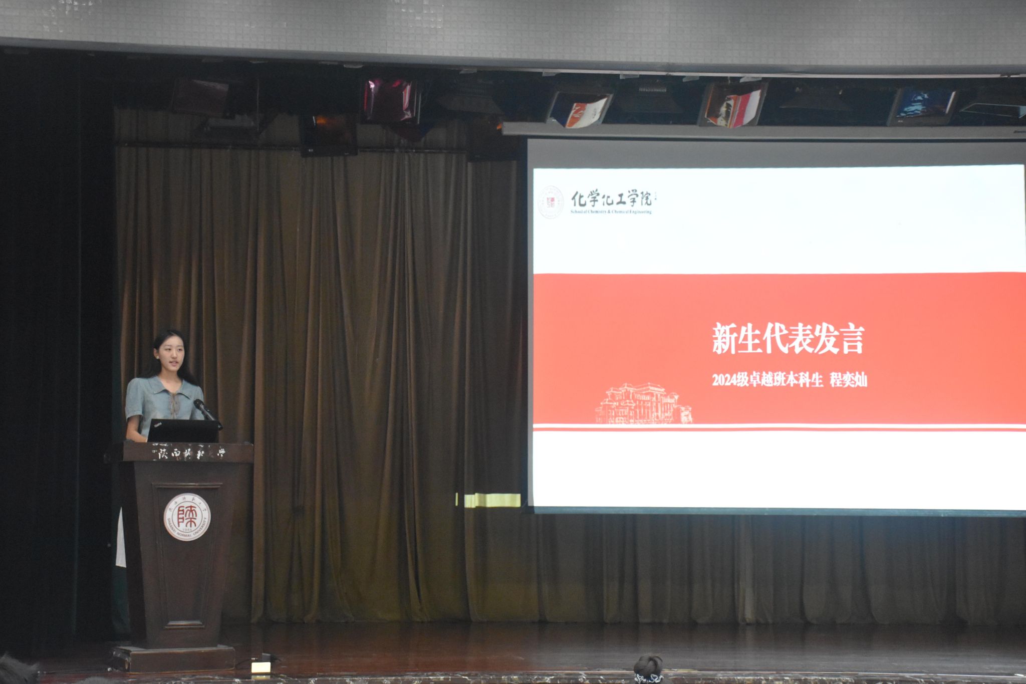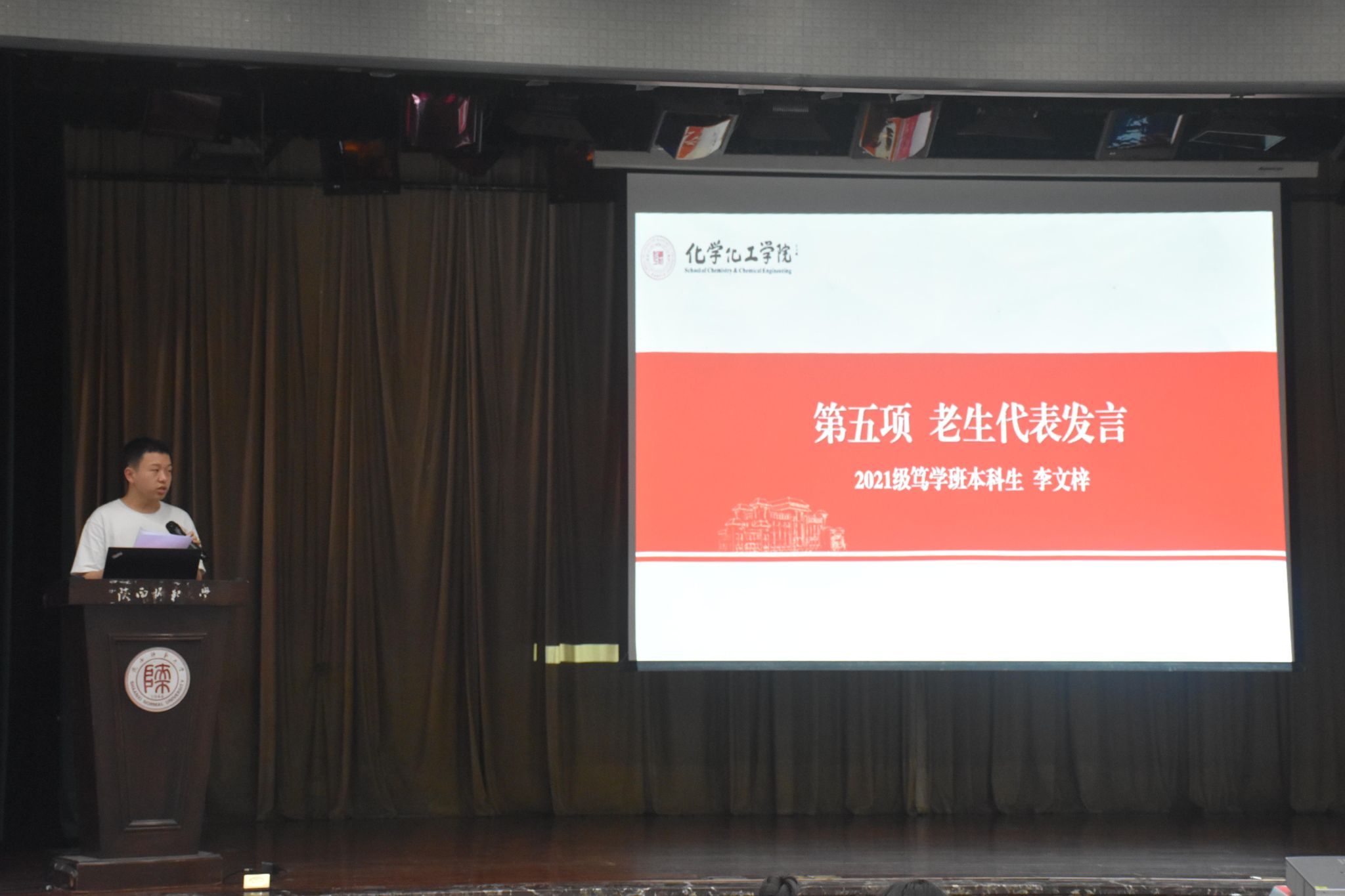 在校生代表李文梓和新生代表程奕灿两位同学先后发言,李文梓同学分享了大学四年在学习和科研上不断探索,最终以优异成绩保送至北京大学的心路历程,鼓励大家要敢于尝试,勇于探索,不断向属于自己的高峰攀登。程奕灿同学代表新生发言,她对入学后学院和老师对自己的关心关怀表示感谢,分享了自己报考公费师范生的初衷,号召广大同学要铭记初入大学时的雄心壮志,通过奋斗来书写属于自己精彩青春。