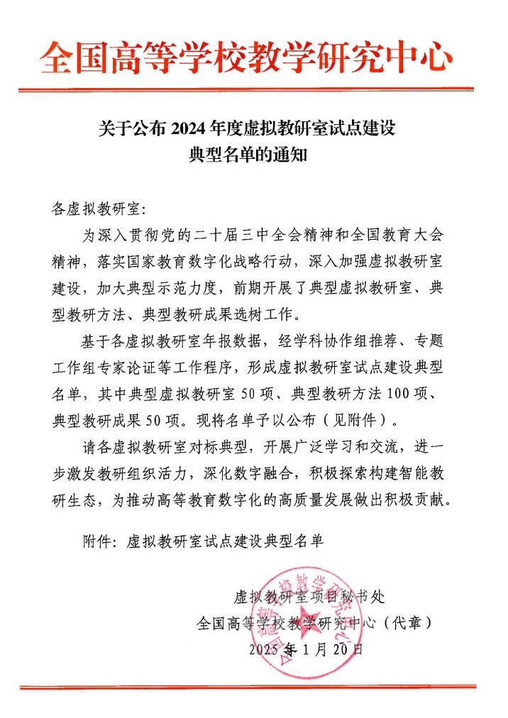 为深入贯彻落实党的二十届三中全会精神和全国教育大会精神,全面推进国家教育数字化战略行动,进一步加强虚拟教研室建设,全国高等学校教学研究中心组织开展了2024年度典型虚拟教研室、典型教研方法及典型教研成果评选工作。经过学科协作组推荐和专题工作组专家论证,由房喻院士担任负责人的小说网