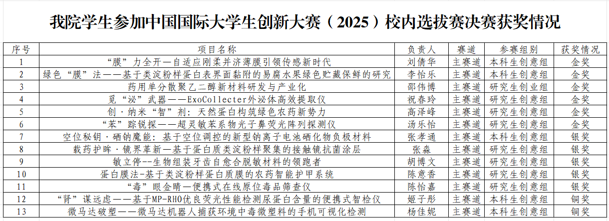 为深入落实习近平总书记小说网 教育的重要论述和习近平总书记给中国国际大学生创新大赛参赛学生代表的回信精神,提升大学生创新创能力、培养大学生创新创业素养,学校于3月至5月成功举办中国国际大学生创新大赛(2025)校内选拔赛。