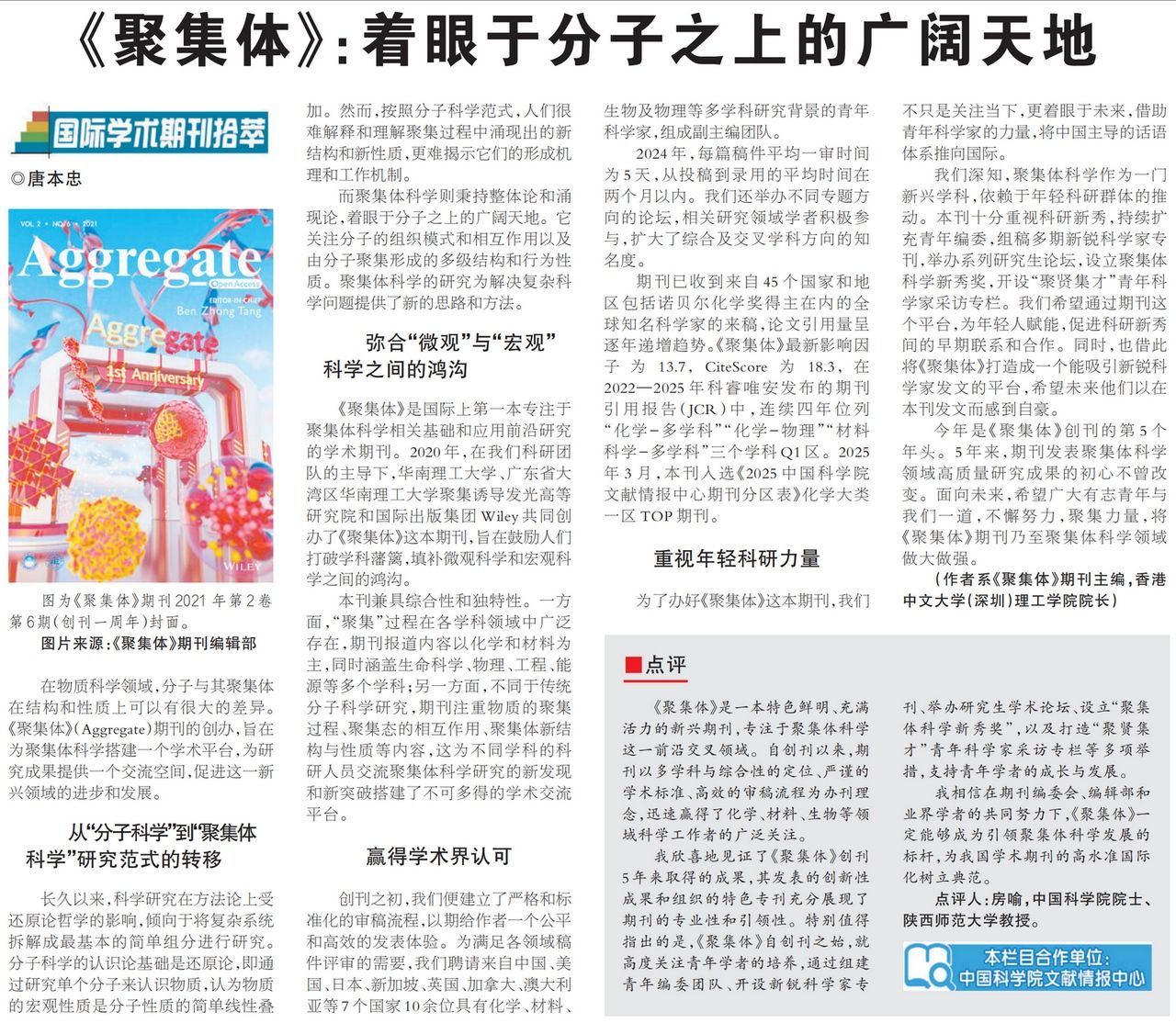 在同一版面,《聚集体》期刊主编、香港中文大学(深圳)理工学院院长唐本忠院士发表了题为“《聚集体》:着眼于分子之上的广阔天地”的文章,回顾总结了《聚集体》创刊5年来的发展历程,表示“发表聚集体科学领域高质量研究成果的初心不曾改变”,希望“将《聚集体》期刊乃至聚集体科学领域做大做强”。