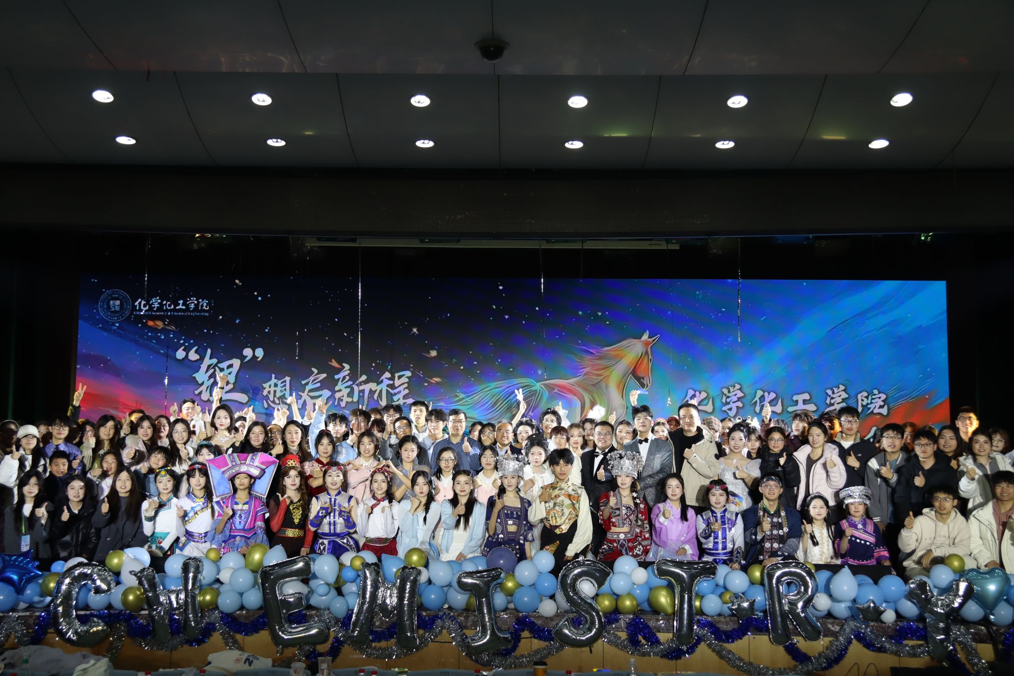 歌曲《如果可以》以温暖声线传递同窗情谊;舞蹈《语焰流光,现青春之彩》以灵动舞姿绽放青春活力;小品《少年与歌的出逃计划》在欢笑中展现逐梦的勇气与陪伴的真挚。朗诵《化韵华章,学致青春》将学科特色与青春志向相融合,彰显化学人的文化自信与使命担当;乐器演奏《青花瓷》以中西合璧的形式演绎经典,展现艺术融合之美;舞蹈《彩袂聚欢歌,同心共筑梦》由多民族学生共同呈现,生动诠释了民族团结、和谐共荣的时代画卷。晚会最后,全场齐唱《我爱你中国》,用歌声抒发对祖国的深厚情感,将现场气氛推向高潮。