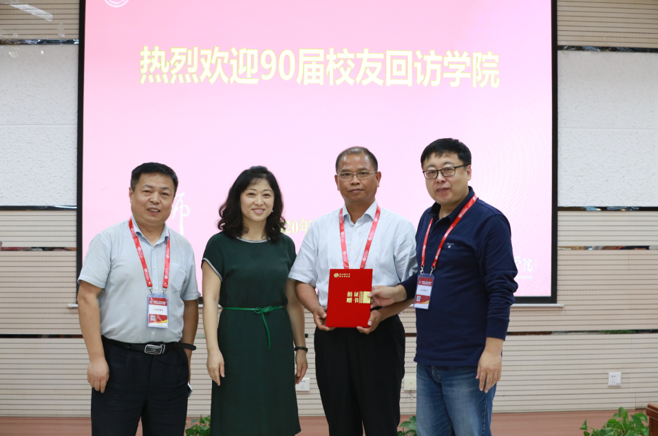 上午9时,化学系90届返校校友乘车从雁塔校区来到长安校区终南音乐厅参加学校1990届毕业生毕业30年纪念大会。学校党政领导,时任校领导、系领导和任课教师代表,各地校友会会长、副会长、秘书长,以及各学院、相关职能部门负责人出席了大会。房喻教授受学校和校友邀请参加了全程纪念活动。化学系90届校友代表王琪为时任教师代表周宝石老师献花,以谢授业之恩、传道之情,并代表化学系校友接受学校赠送的《师大故事》。