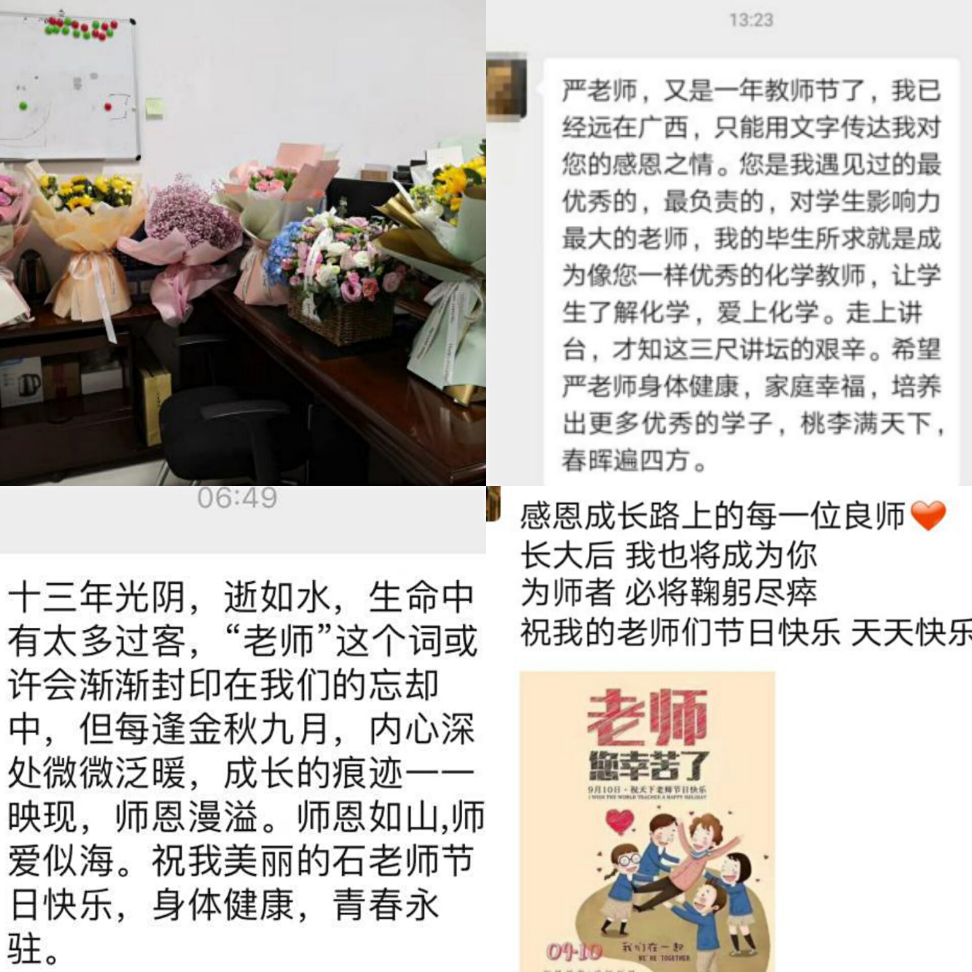 对于一向动手能力较弱,记性也差的我来说实验是硬伤,每次实验课我都极其恐惧,可幸运的是我遇到了汤薇老师。返校后第一次分析实验,我操作起来很费劲,汤老师笑着说:“没事儿,大家都是第一次做,慢慢就好了。”接着我又犯了一个不该犯的错(酸碱滴定管都装了碱,还傻傻不自知)汤老师竟然没有责怪我,还一直给我指导实验,感谢我的汤薇老师,很幸运遇见了您!祝您教师节快乐!