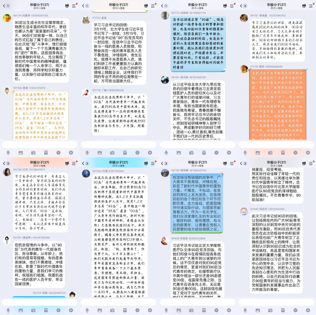 研究生有机党支部于3月19日线上组织了“学习习近平给北京大学援鄂医疗队全体“90后”党员的回信”主题党日活动。本次线上活动主要以群里文字交流形式展开。