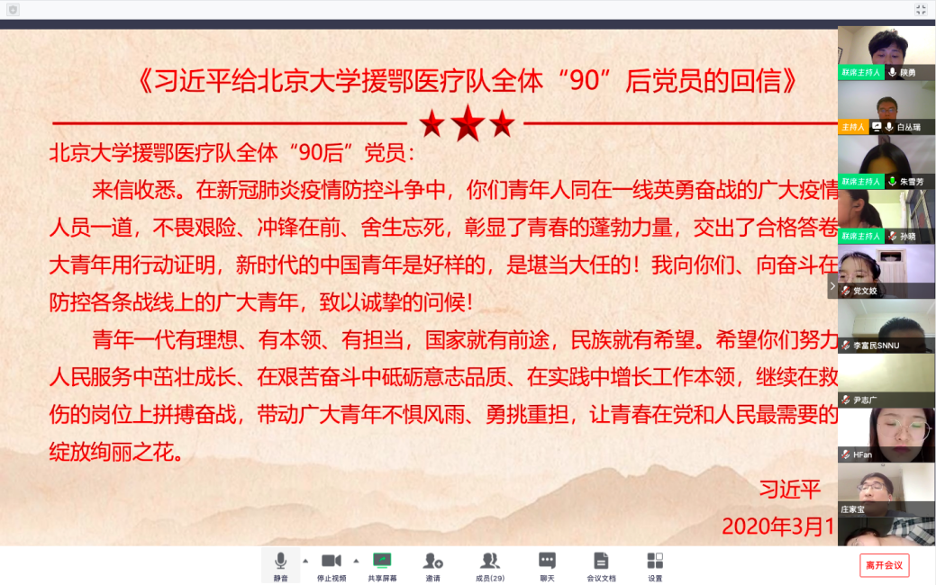 研究生物化党支部3月20日线上召开了主题党日活动。会议中,支部成员围绕总书记给北京大学援鄂医疗队全体“90后”党员的回信展开了激烈的讨论。
