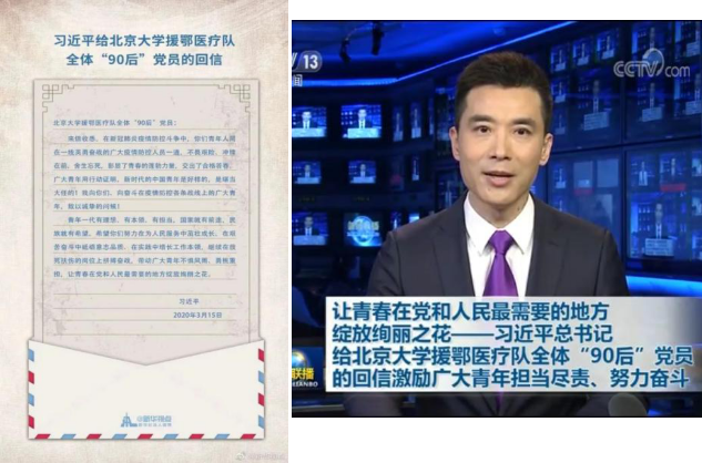 3月15日,中共中央总书记、国家主席、中央军委主席习近平给北京大学援鄂医疗队“90后”党员回信,向他们和奋斗在疫情防控各条战线上的广大青年致以诚挚的问候,勉励广大青年不惧风雨、勇挑重担,让青春在党和人民最需要的地方绽放绚丽之花。小说网