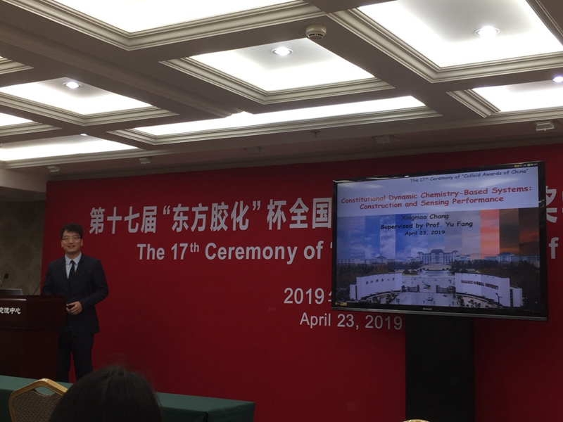 光子鼻与分子材料研究团队房喻教授课题组的博士研究生常兴茂和祁彦宇分别获得了“东方胶化杯”全国胶体与界面化学研究生优秀成果一等奖和三等奖,刘小燕副研究员受邀出席了颁奖典礼。颁奖典礼上,刘小燕作为受邀嘉宾对获奖学生致颁奖寄语,并做了精彩的邀请报告,介绍了课题组近期科研成果;常兴茂同学汇报了博士阶段的科研成果。与会嘉宾对光子鼻与分子材料研究团队所取得的研究成果给予高度肯定。