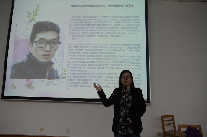 研究生新生思想政治教育专题讲座在文津楼202报告厅进行,高玲香教授为2018级研究生作了题为“笃学、勤思、敏行、明德”的入学教育报告。