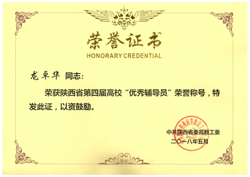 本科生辅导员龙卓华荣获“陕西高校优秀辅导员”荣誉称号。