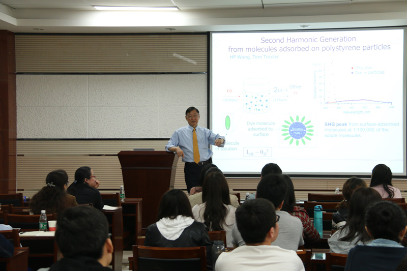 师生带来题为“Second Harmonic Light Scattering from Colloidal Objects”的精彩报告。报告由房喻教授主持,学院陈亚芍、丁立平、张颖、杨鹏、边红涛、刘静,刘太宏、彭军霞、彭浩南、王红艳等老师以及和相关专业博士生、硕士生和本科生聆听了本次报告。