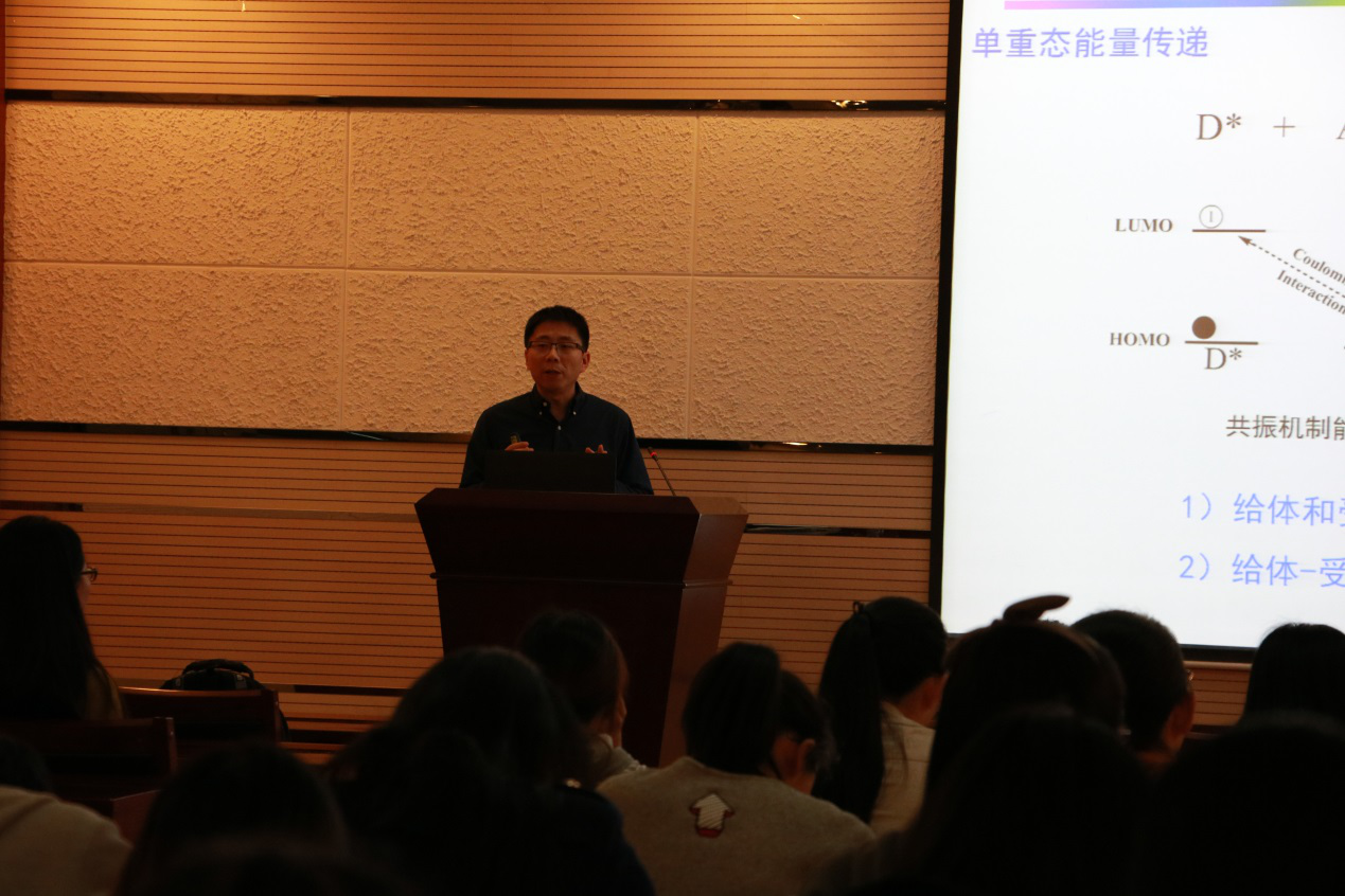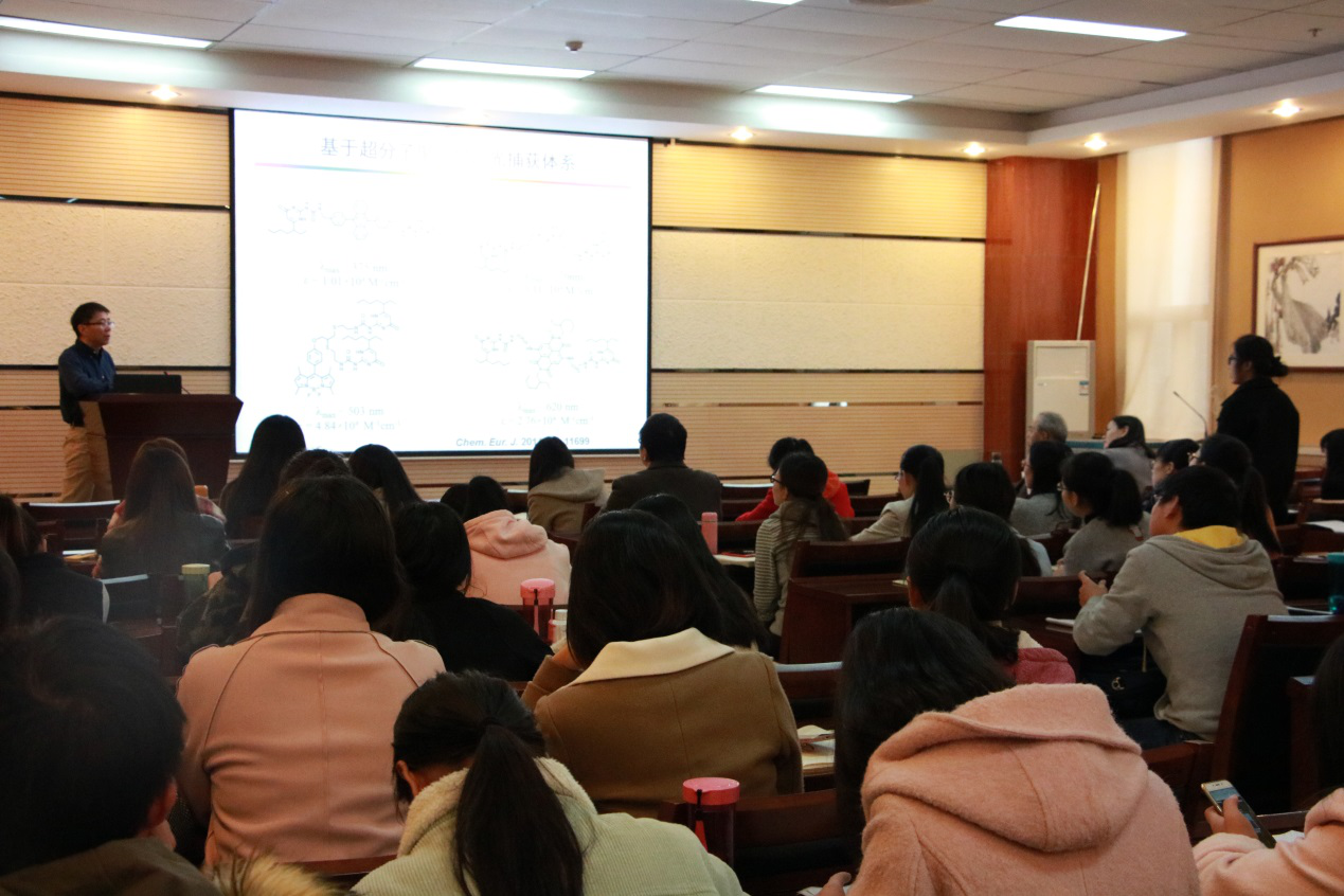 超分子构筑的胶束和纳米晶的研究工作进行了详细解读。他讲到,其课题组利用超分子组装,构筑了几个具有高效光捕获性能的新型光捕获体系,并且制备方法简单,给体受体比例易于调控,避免了繁琐的合成和分离过程,为研究光捕获机制及在多个领域的潜在应用提供了基础。他在总结中指出,基于有机纳米晶的光捕获体系,纳米晶整齐有序的排列大大的提高了捕获效率。此外,能量给体与受体的种类可以方便的进行改变,并且二者之间的比例容易调节,为深入研究光捕获体系中的能量传递过程提供了新思路。报告结束后,杨清正教授与房喻老师展开了精彩的讨论并耐心解答了师生们的提问,赢得一片掌声。