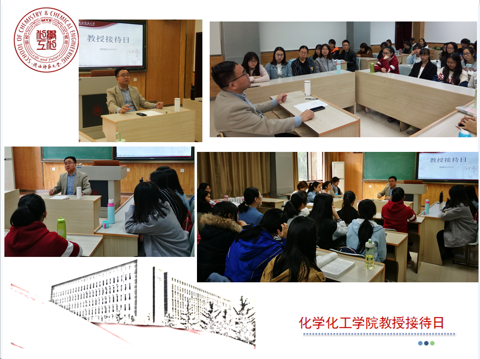 10月30日上午,徐峰教授应邀参加了2016级应用化学一班的教授接待日活动。在轻松愉快的氛围中,徐老师用诙谐幽默的语言向同学们讲述了自己的求学之路的艰辛,并用身边的事例告诉大家,大学生应该尽快适应社会,面对现实压力的同时也要学会调节心理压力。对于同学们考研就业方面的问题,徐老师指出,要选择适合自己的、同时也要适应社会需要的人生道路。最后,徐老师鼓励同学们出国留学,通过自己坚持不懈的努力,实现人生目标。