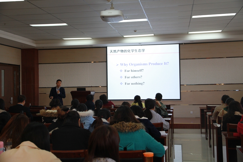 随后中国科学院昆明植物研究所博士生导师黄胜雄研究员,做了《探索天然药物的化学结构多样性及生物起源》的报告。在报告中黄教授通过举例蓝藻固定CO2、紫杉醇的历史、天然产物作为生物能源说明了天然产物的广泛应用。同时,黄教授介绍了天然产物化学的和生物合成的历史发展,并以自己课题组工作和研究方向为例,向同学们展示了科学研究的思路方法,为同学们提供了解决问题的思路。在报告最后,黄教授鼓励大家到昆明植物研究所参观学习,欢迎各位老师指导工作。报告最后,黄胜雄研究员从校友的角度激励同学们积极上进,科研道路上唯有奋进前行,“永远不要让自己轻松”。