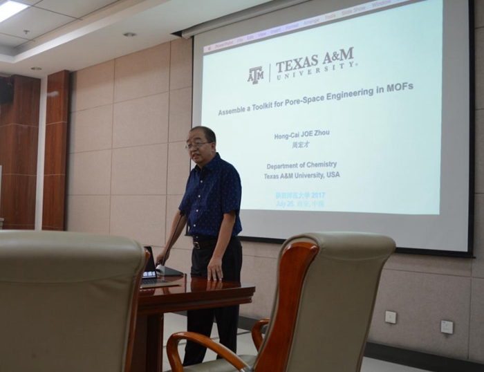 报告中,周宏才教授详细地介绍了其课题组最近的相关工作,并重点向老师及同学们讲解了三种合成策略来制备高稳定性和性能良好的MOFs材料:1,利用软硬酸碱理论形成稳定的金属-配体键,从而形成稳定MOFs;2,利用动力学原理来调控MOFs的维度及性能;3,后合成金属置换及氧化策略来制备其他方法难以合成的MOFs材料。周老师形象的将这三种策略称之为“工具箱”,并通过通俗易懂的语言向大家娓娓道来,其深入浅出的讲解给同学们留下了深刻的印象。报告结束后,周老师与在场的老师们进行了热烈讨论,对同学们的积极提问也给与了解答与建议。