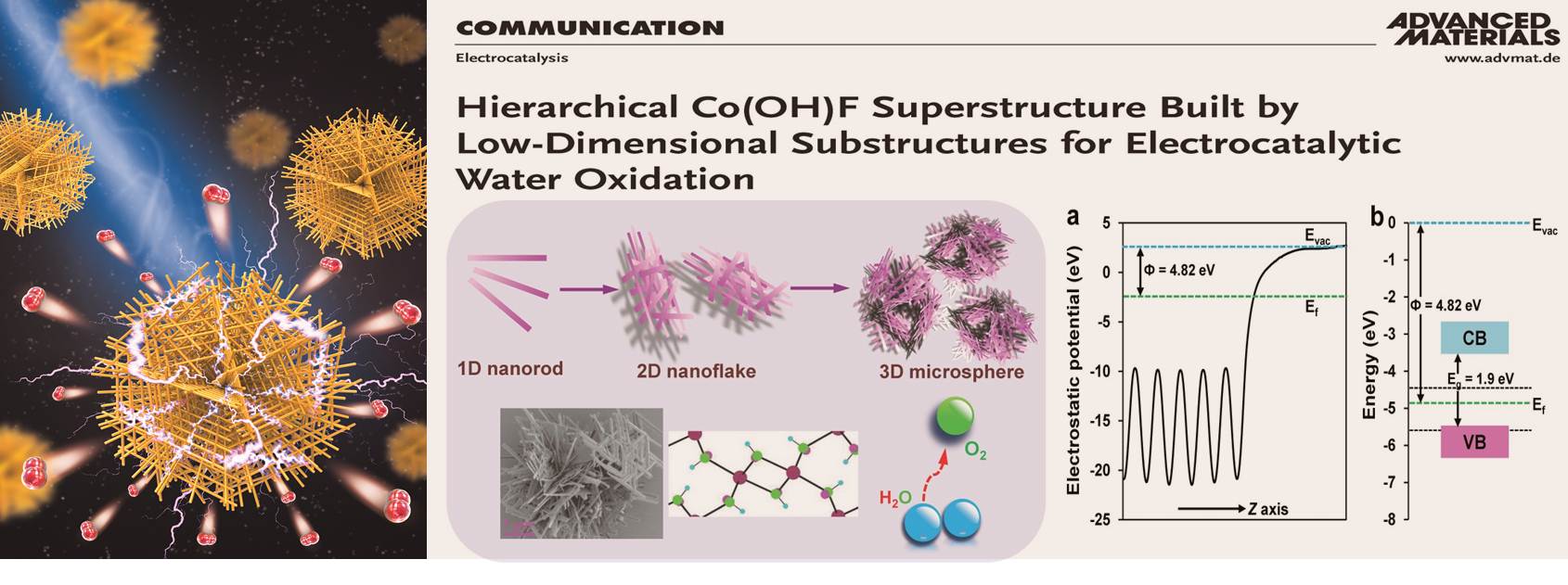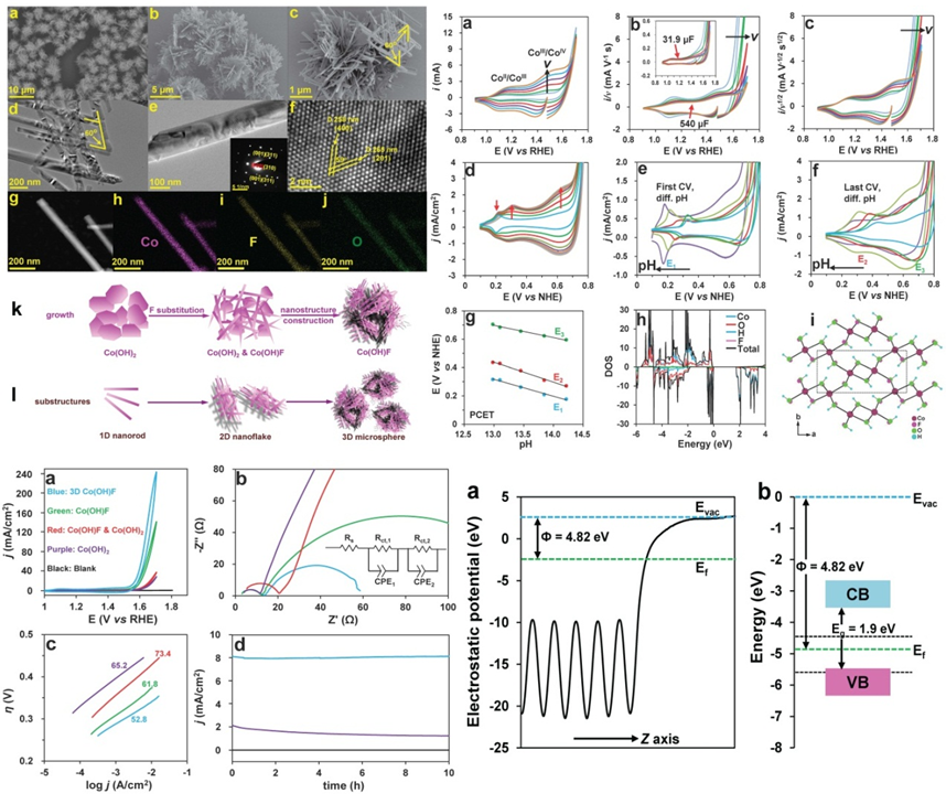 基于前期的系列结果,团队研究人员在开发用于电催化水氧化的新材料与新结构方面进行了大量尝试,并于近期成功合成了新颖的Co(OH)F多级结构材料。该材料是一种新奇的多级组装体系。其基本结构单元为单晶纳米棒,其次级结构为由纳米棒编织而成的多孔纳米片层结构,其高级结构为由纳米片层结构搭建而成的独立微球聚集体超级结构。这种新颖的材料组装形式导致最终结构中同时包含了一维、二维和三维材料特性,这些多维特性在催化过程中均起到明显的积极作用。一维基本单元的各向异性特性带来快速的电荷转移能力、高比例的低能晶面和超高表面积体积比率;一维结构编织的二维单元带来催化过程中快速的传质与传荷;三维超级结构的高孔隙率可以极大提升底物扩散效率。同时,Co(OH)F也是首次被报导为电催化水氧化催化剂。惰性氟配体的引入不仅形成了新颖的组装结构并很好的稳定了催化剂表面结构。电化学及理论计算表明在催化水氧化前表面二价钴被逐步氧化成高价态活性钴中心。该论文的第一作者为小说网