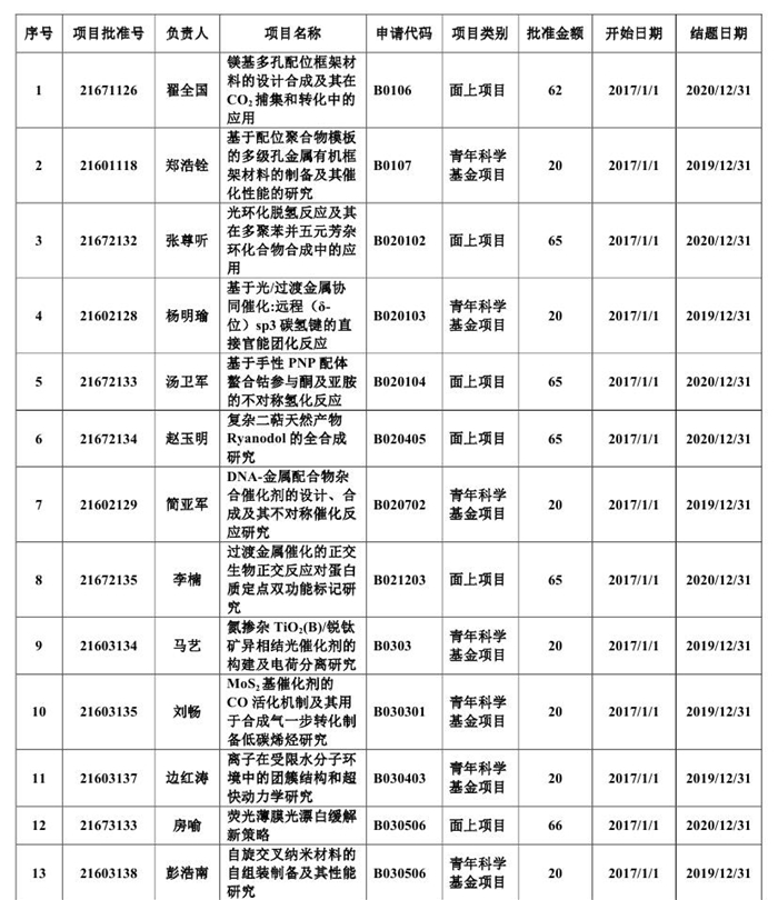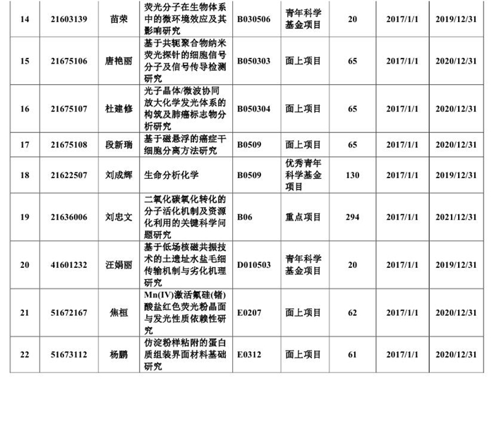 全校共有103项国家自然科学基金项目获得立项,直接经费4323万元。小说网 22个项目获得资助,资助直接经费1310万元。其中,刘忠文教授申报的重点项目“二氧化碳氧化转化的分子活化机制及资源化利用的关键科学问题研究”获得立项(全校唯一),资助直接经费294万元,刘成辉教授申报的优秀青年科学基金项目“生命分析化学”获得立项(全校唯一),资助直接经费130万元,此外,小说网 还获得面上项目11项,青年项目9项。