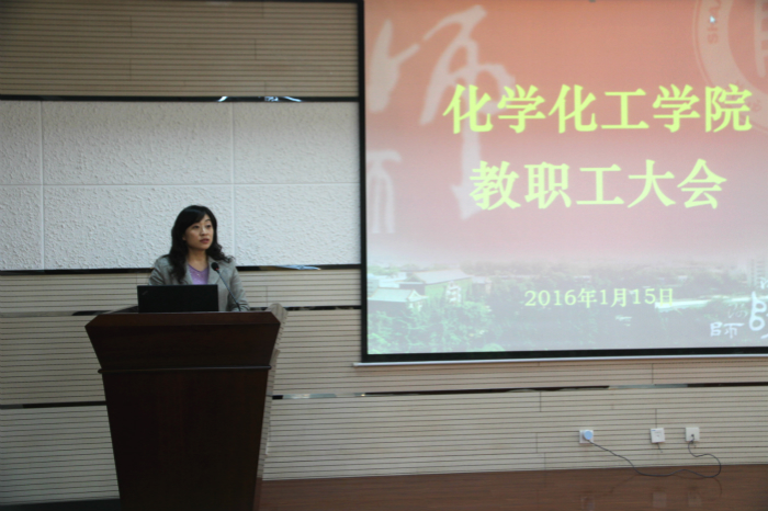李保新副院长就教学和实验室管理工作进行总结,他从学院基本教务工作、《人才培养方案》的修订、“高校巡视诊断工作”的圆满完成、“化学卓越教师班”和“笃学化学实验班”的创立等方面对2015年度教学工作进行了汇报。他表示这些亮点工作将会极大程度地促进本科教学的规范化;拔尖人才培养方案的落实和完善将推动学院对于人才培养工作的重视,从而培养出卓越的教师和高端的学术型人才。