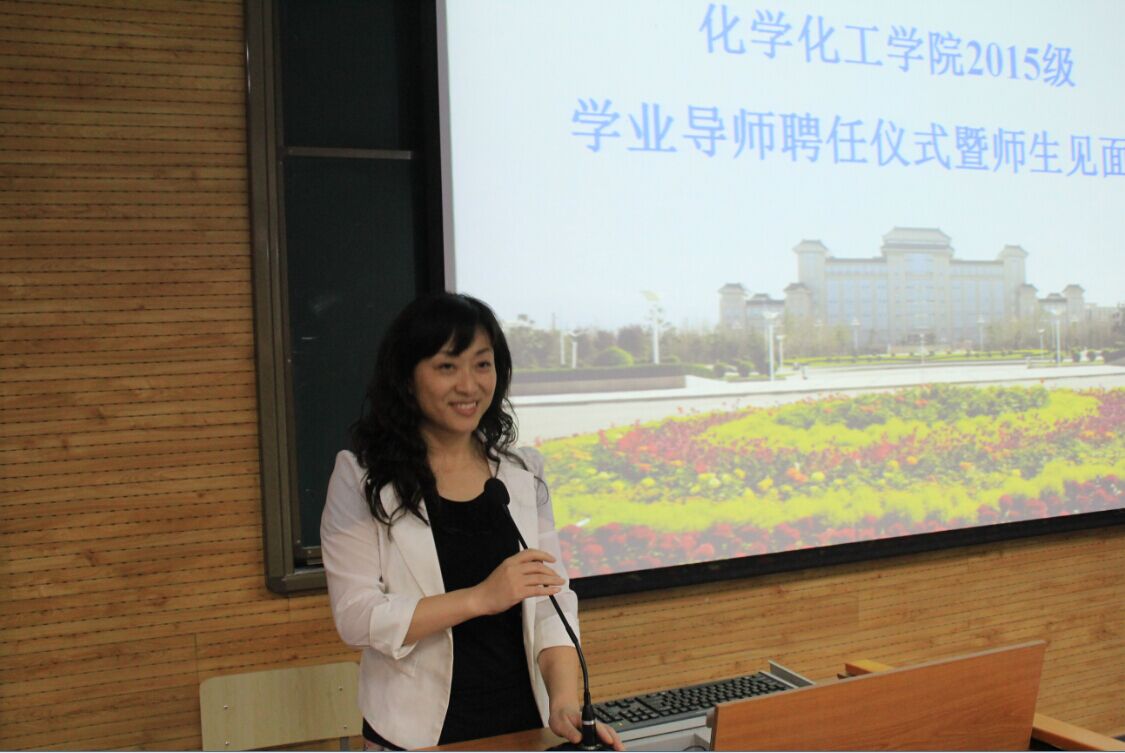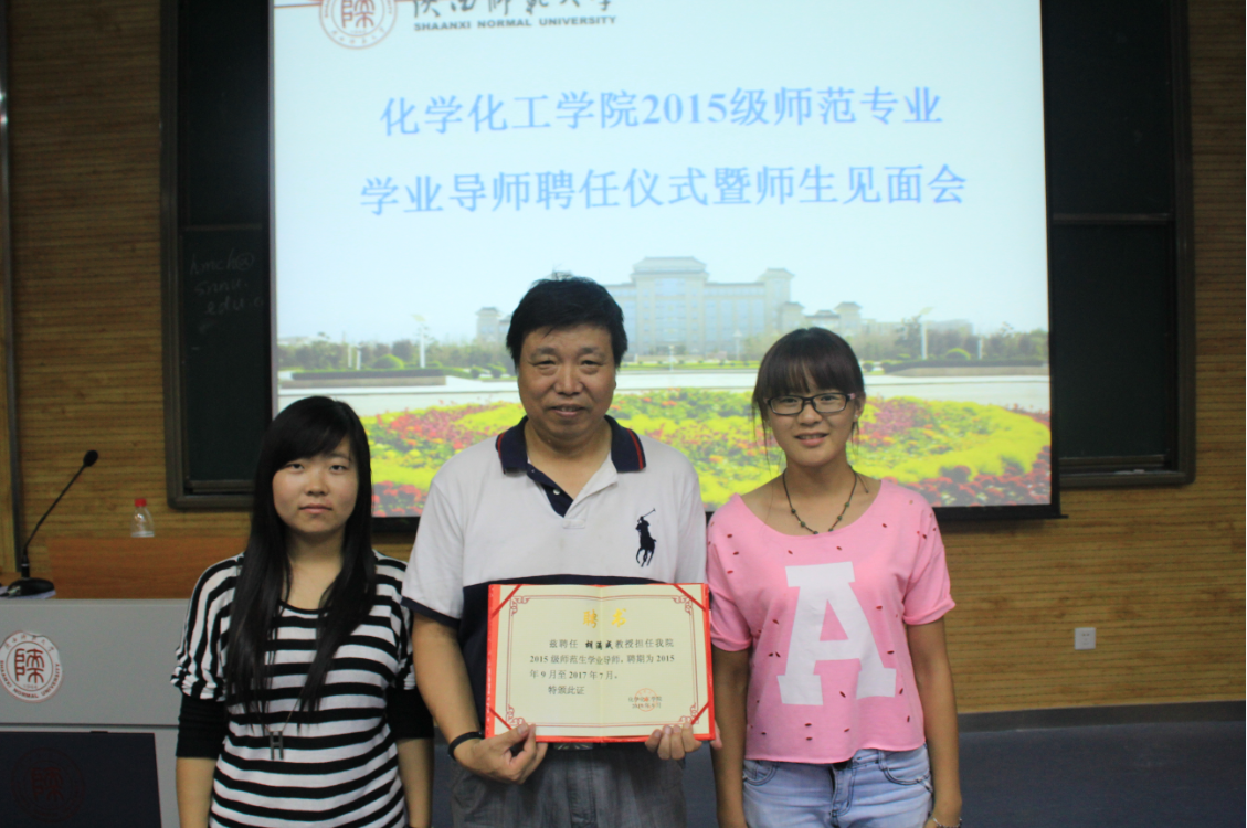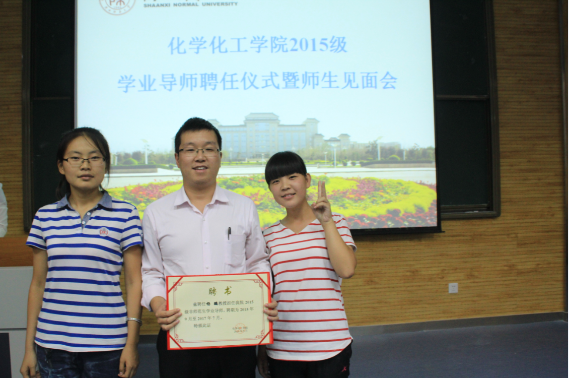 为一、二年级本科生聘任学业导师的目的及重要意义。并向2015级学生详细介绍了胡满成教授和杨鹏教授的丰富的求学经历、不凡的教学能力及突出的科研成果。接下来,高玲香教授邀请四位学生分别为两位老师颁发学业导师聘任证书,胡满成教授被聘为2015级师范专业学生的学业导师,杨鹏教授被聘为非师范专业学生的学业导师。简短的聘任仪式结束后,学生们分别与导师举行了师生见面会。