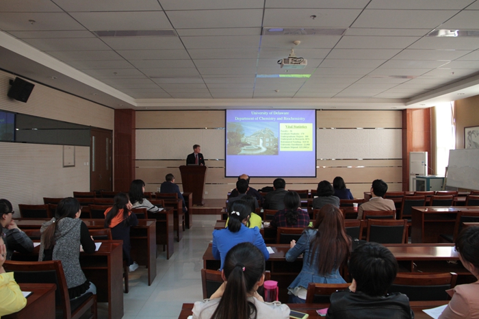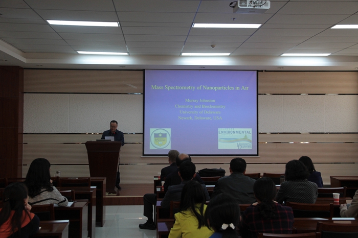 报告会上,Murray V. Johnston教授首先介绍了特拉华大学所在的特拉华州纽瓦克市的当地环境概况。由此引出了本次报告的主题:如何对空气中的纳米颗粒进行质谱分析。在报告会上,Murray V. Johnston教授向在场师生介绍了其实验室特有的纳米气凝胶质谱仪(nanoaerosol mass spectomete),并着重介绍了该仪器对空气中粒子浓度分析的工作原理。在场师生就报告内容与Murray V. Johnston教授展开了讨论,报告会在一片热烈的气氛中圆满结束。