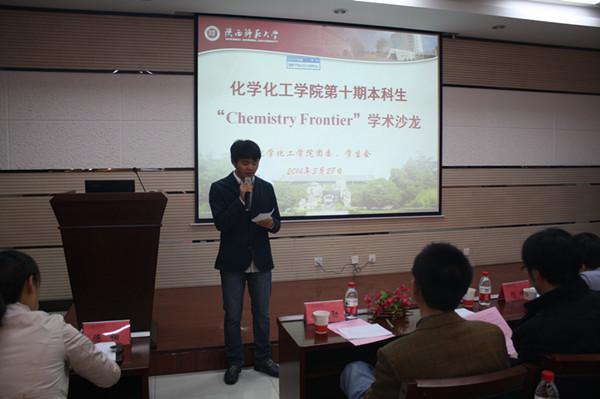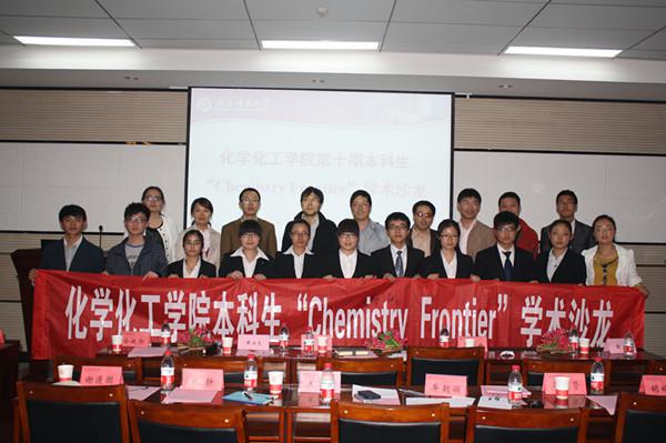 在致知楼1668会议室举办第十期本科生“Chemistry Frontier”学术沙龙活动。学院教师周青、杨鹏、岳宣峰、黄治炎、俞斌勋老师应邀担任了本期学术沙龙评委,学院分党委副书记王启明、团委书记陈钿、辅导员牟朝丽、谢遵园老师也应邀参加了活动,本次活动由学生会主席余林升主持。