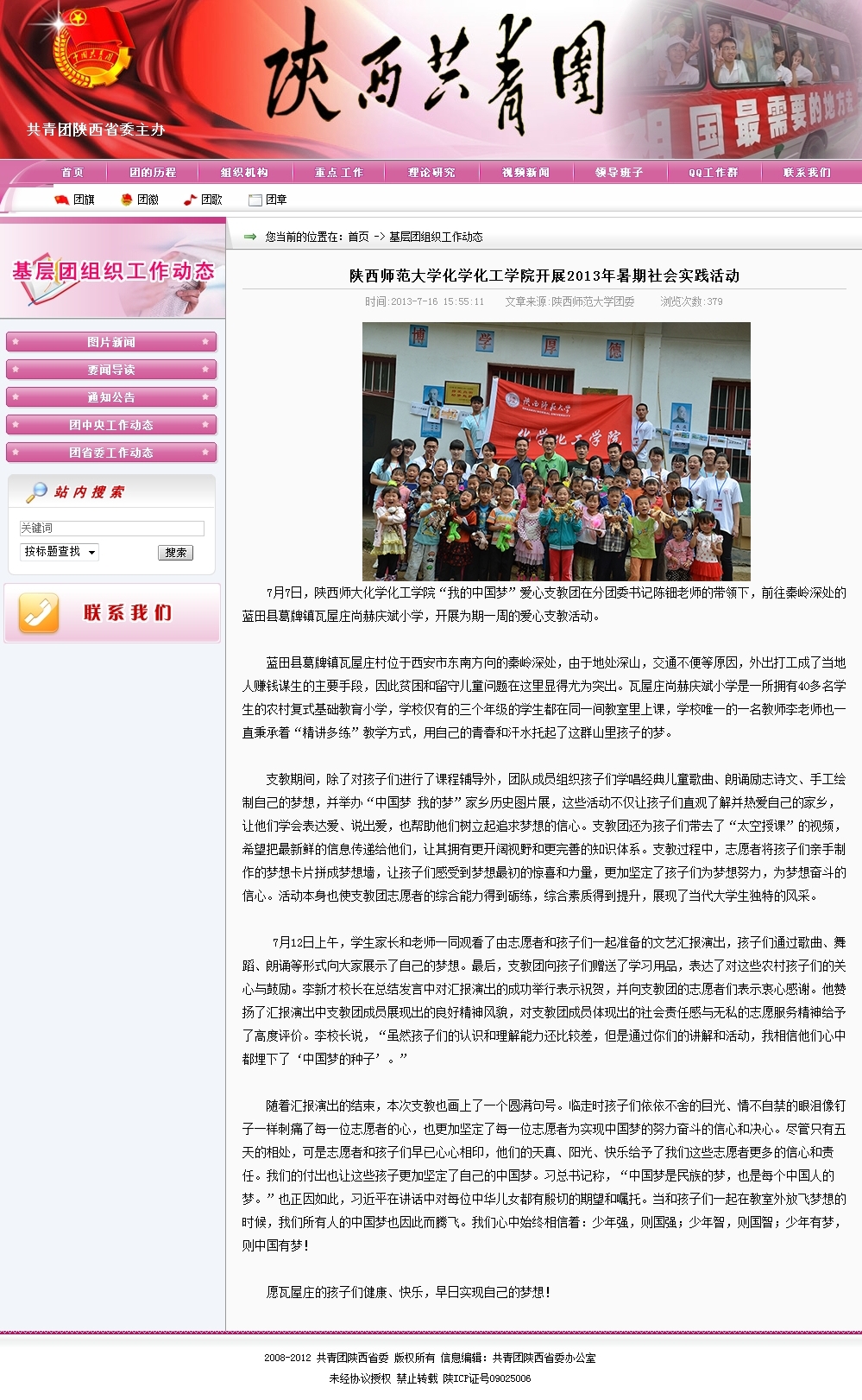 2013年暑期,学院团委积极响应中宣部、教育部、团中央和全国学联的号召,根据校团委“实践激扬青春志,奋斗成就中国梦”的社会实践主题,围绕“按需组队,点面结合,突出重点,双向受益,项目运作,重在实效”的原则,在学院范围内积极宣传、动员、组织和策划,组建了“我的中国梦”爱心支教团队获得校级重点项目资助,学生自组团队“陕西农村留守儿童生活和受教育状况调查研究”团队获得校级特色项目资助。整个暑期,同学们深入基层支教支农并走访调研,不但在服务社会的过程中提升了素质与能力,而且还增强了社会责任意识和使命感。2013年,小说网