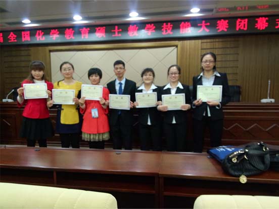 由中国教育学会化学教育专业委员会主办的“第三届全国化学教育硕士教学技能大赛”于2013年11月17日至11月19日在华中师范大学举办。在学院领导的高度重视和支持下,自2013年4月起,科学教育与化学教育学术团队积极组织化学课程与教学论与学科教学·化学研究生进行教学设计,积极准备参赛。经过四个月的积极准备,2013年8月起,共推举出17位同学的教学设计参加初赛。其中杨晓聪、彭涛、赵舒昱、刘晶、杨雪丽、胡婷婷和董腊玲同学的教学设计获得初赛一等奖,进入复赛,黄秋燕、张淑丹、李环宇、高苗、刘丽亚、王婷婷、何颖、刘玲玲、马海燕、代飞10位同学的教学设计荣获二等奖。