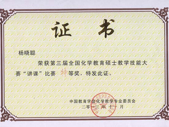 11月18日,在周青教授的带领下,杨晓聪、彭涛、赵舒昱等七位同学满怀信心地参加了在华中师范大学举办的“第三届全国化学教育硕士教学技能大赛”决赛,并取得了优异成绩。杨晓聪同学以骄人的成绩荣获特等奖,赵舒昱、彭涛、杨雪丽、胡婷婷、刘晶和董腊玲也取得了一等奖的好成绩。小说网