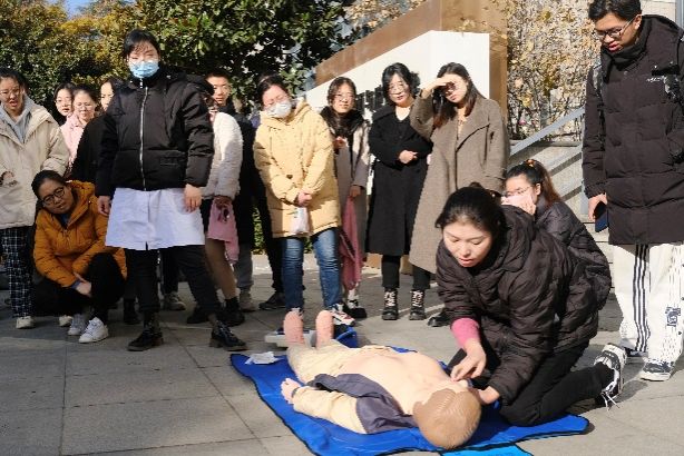 第二阶段,包括心肺复苏、灭火设备使用、喷淋装置使用在内的应急救助培训三大项目。校医院相关人员及副院长肖新军等专门就心肺复苏这一关键急救技术,按照“判断患者反应、纠正患者体位、判断脉搏、胸外按压、开放气道、人工呼吸”6个步骤向师生进行了现场示范;实验中心老师向师生演示了灭火器、灭火毯等消防器材的功能及使用方法;各楼层负责老师指导并监督喷淋装置的使用。此次培训的三大项目,学院2022级、2023级硕士生、博士生、国际生等悉数参加,并逐一进行了实践操作。