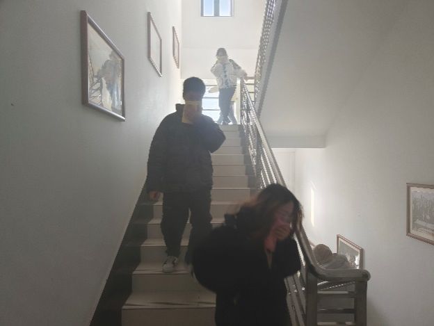 27日早上7:00开始,在致知楼一层南门通过二维码统计进入楼层所有人员数量,同时发放消防安全物资。9:15左右,在模拟火灾发生场景下,总指挥王长号发布应急疏散指令,各楼层点燃烟雾发生器和拉响警报信号,应急疏散环节迅即展开,各应急小组按照统一领导、综合协调、分级负责的应急处置原则迅速到达各自岗位,对照事故的发现与报告、应急指挥与协调、现场救援与疏散、事后检查与核查的演练流程,指挥师生员工打湿毛巾、捂住口鼻、低头弯腰、有序撤离。整个人员疏散过程演练用时4分40秒,共统计疏散人员886名。