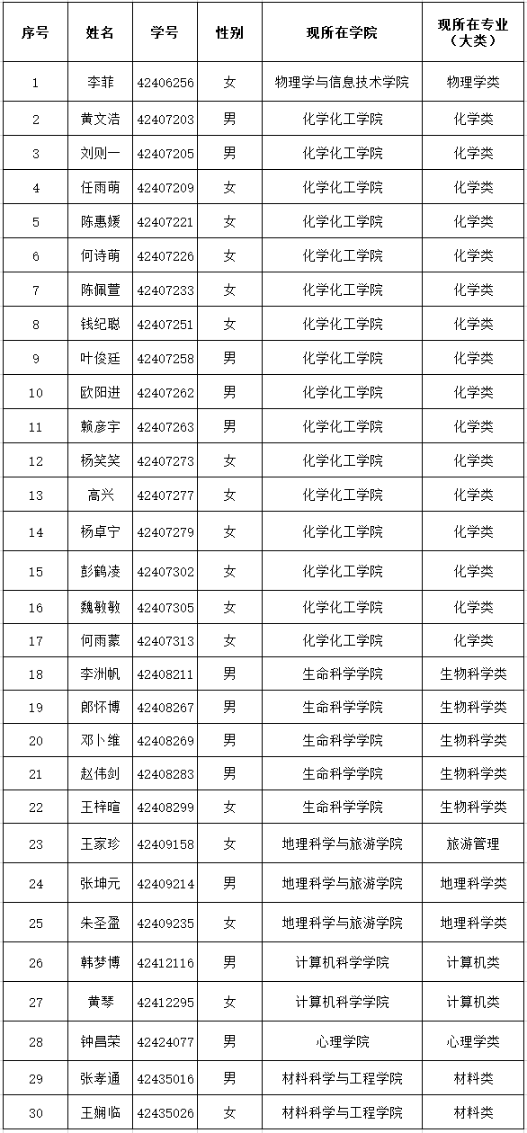 根据《小说网 做好2024级“人文科学试验班”“理科试验班”新生选拔工作的通知》和《小说网 2024级本科生化学笃学班选拔综合考核方案》,小说网 在学生自愿报名基础上,经过笔试、综合面试考核环节,现将2024级化学笃学班拟入选学生名单公示如下(按照学号由小到大顺序排列):