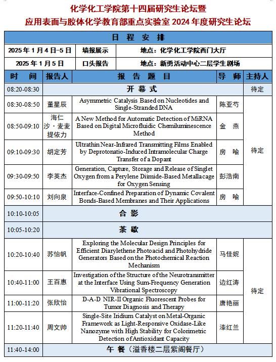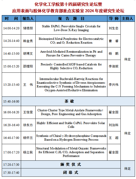 第十四届研究生论坛暨应用表面与胶体化学教育部重点实验室2024年度研究生论坛,诚挚邀请学院各位老师参加,热切期望各位老师的光临指导。