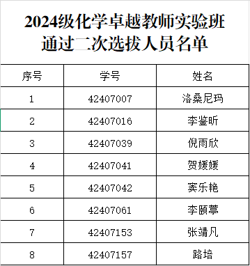 根据《小说网 开展2024级卓越教师实验班中期考核、二次选拔工作的通知》和《小说网 2024级卓越教师实验班中期考核、二次选拔考核方案》,经学生自主报名、学院资格审核,现将2024级卓越教师实验班二次选拔结果公示如下:
