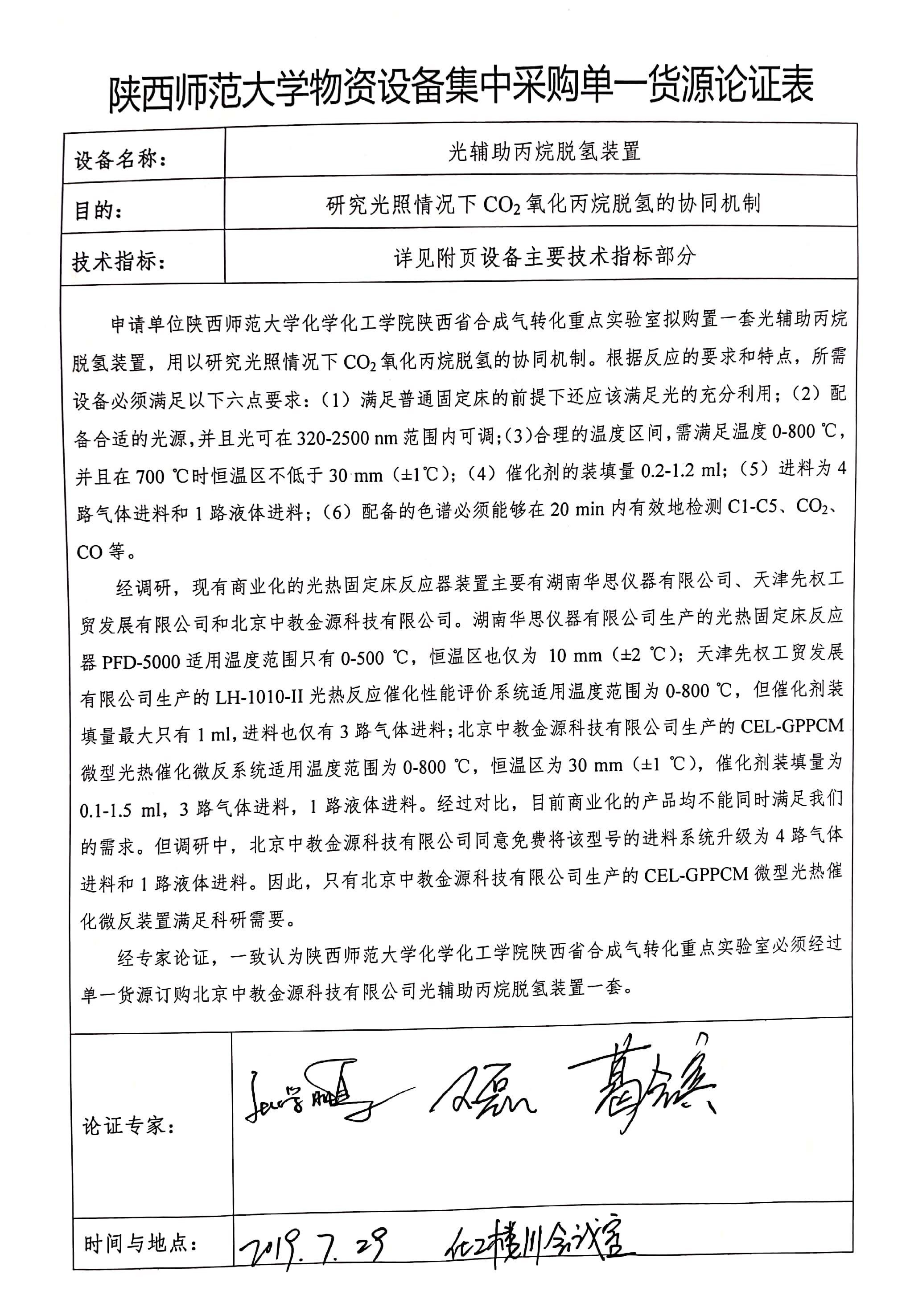 按照国家法律法规和学校相关规定,拟采用单一货源形式采购北京中教金源科技有限公司光辅助丙烷脱氢装置一套。