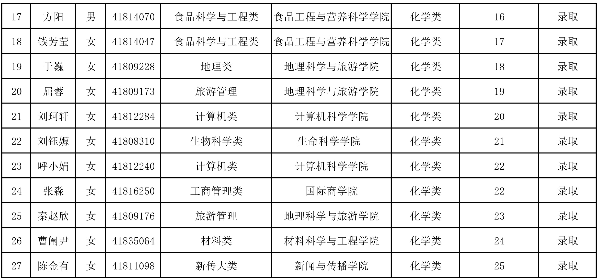 根据《小说网 本科非师范专业大类招生培养改革方案(试行)》办法,小说网 对2018级申请转入化学类的非师范专业学生进行笔试和面试综合考核。现有27名学生通过考核,现将学生名单公示如下: