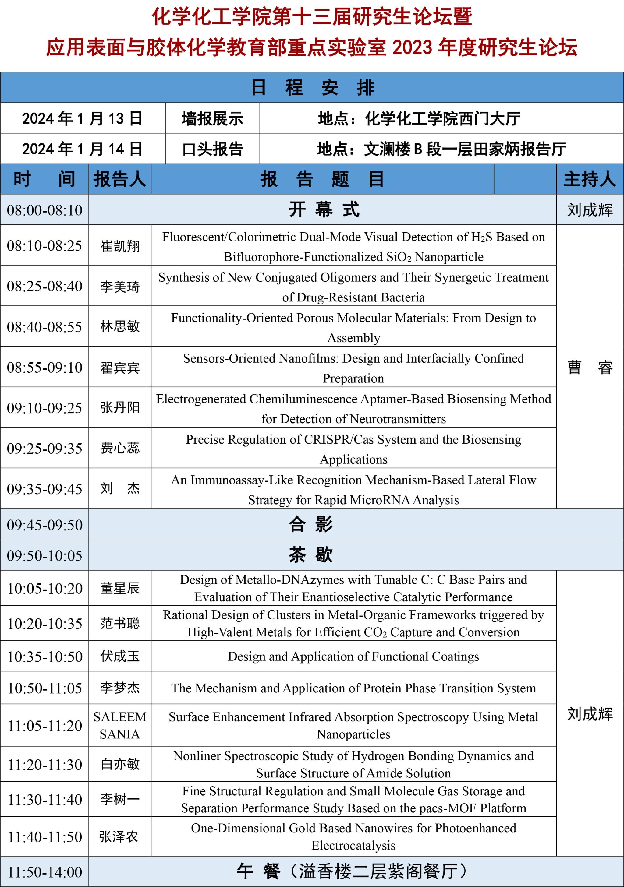 “第十三届研究生学术论坛暨应用表面与胶体化学教育部重点实验室2023年度研究生论坛”,诚挚的邀请学院各位老师参加,热切期望各位老师的光临指导。