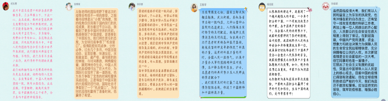 为进一步引导学生加入抗“疫”行列,学院开展了“共抗疫情,爱国力行”线上主题演讲比赛和“战‘疫’·向上的力量”主题征文比赛,团员青年通过铿锵的字句和细腻的笔触,描述了抗“疫”期间一幅又一幅发人深省的画面,表达了自身对民族精神、时代精神和爱国主义精神的深刻理解。
