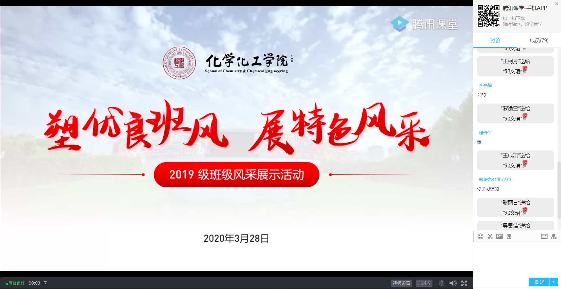 2019级辅导员邓文珺以“强班风、优学风、促校风”为宗旨,利用“腾讯课堂”在线平台,策划并开展班级风采“云展示”,促进班级之间的交流碰撞,推动良好班风的形成。