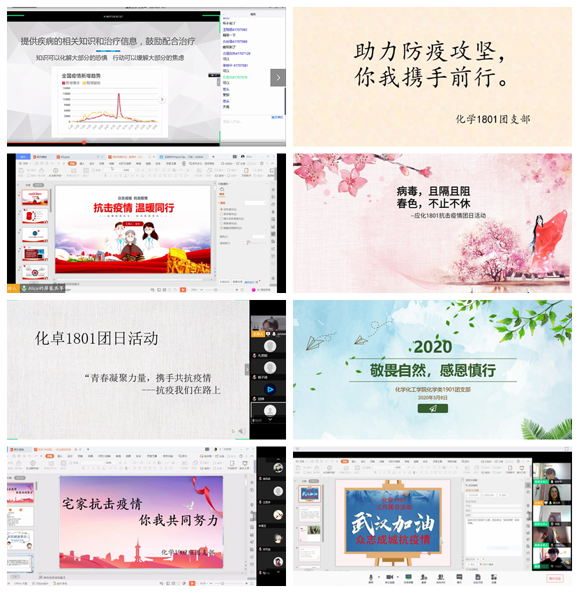 其中,化学类1901团支部、化学1702团支部组织团员青年积极参与线上打卡,通过云学习,让团员青年有了很多思考和收获;化学1802团支部围绕疫情防控知识进行了线上专题交流讨论,化学1904团支部开展了“疫情防控,知识竞答”活动,学习疫情防护知识,增强防护意识;化学1602团支部将班级每一位团员青年为武汉制作的加油手抄报和手写祝福剪辑成视频《天佑中华,武汉加油》,化学1904团支部拍摄了《静待樱花烂漫时》微视频,致敬作战一线的医护人员,凝聚起众志成城抗击疫情的强大力量;化学1701团支部、化创1702团支部的团员青年们分享了最让他们感动的抗疫故事:奔走在防疫工作的第一线,“不计报酬、无论生死”的医护人员;基层干部、社区工作者用沙哑的声音、忙碌的背影在疫情防控战场上构筑起了一道道“防疫墙”、停课不停学”中的教与学的感人事迹、青年学生开展线上辅导,参与社区疫情防控,用自己的方式坚守着战“疫”的后方阵地。