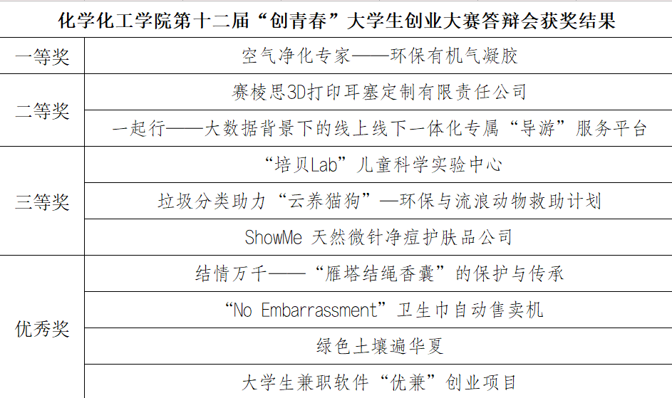 为落实习近平总书记提出的“为青年创新创业开展教育、传递知识、搭建平台、提供机遇”的要求,培养青年大学生的创新意识和创新能力,适应“大众创业,万众创新”的社会氛围,丰富校园创业文化,促进学生对于科研创新赛事的理解,小说网 于11月30日举办了第十二届“创青春”大学生创业大赛答辩会。经作品展示、项目答辩、专家评审,大赛已落下帷幕,现予以公示,公示期为2019年12月1日—3日。期间如有异议,请向小说网 团委反映。