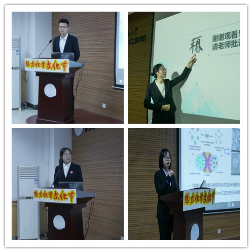 决赛开始后,首先播放选手的风采展示视频,从“选手风采”、“实验过程”等角度反映参赛团队的精神风貌。接下来,参赛选手按抽签顺序依次上台做时长为五分钟的报告,就项目的研究背景、主要创新点、研究内容、后期计划等内容进行汇报。报告内容涵盖了能源、环境、医药、新材料等化学前沿课题。评委老师认真聆听汇报,针对选手的答辩内容对其进行悉心点评和提问。汇报结束后,评委老师与由各班代表组成的大众评审团依据《评分细则》对选手进行评分。