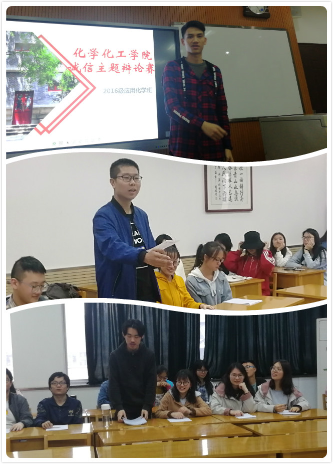 为了响应我校诚信活动月的到来,加强同学们的诚信意识,让同学们都能做一名诚信大学生。2019年4月17日,应用化学1601班全体成员在长安校区文渊楼1621教室举办了以“善意的谎言算不算不讲诚信”为主题的诚信班会。