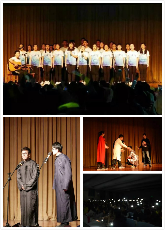 学生会外联部、学习科研部带来的《祖国颂》以激昂的文字歌颂祖国,让祖国看到我们的决心。一颦一笑、一举一动都带着异域风情,舞蹈活泼优美,步伐轻快灵巧,伴着绚丽的舞裙和飘飘的舞步,2017级的少数名族为我们带来了《迷情新疆》。紫云相声社的节目一直深受我校师生的喜爱,本次晚会我们有幸请到两位同学为我们带来了《智取威虎山》,惹得大家捧腹大笑,赢得阵阵掌声。由朝气蓬勃、热情奋发的17级同学带来的合唱《我最闪亮》和民谣串烧《我在这里》,更有乐器合奏《凉凉》引发台上台下大合唱,为大家呈现一场视听盛宴。来自2017级同学的小品《元素之争》、《大一人生》令人眼前一亮,表演投入、剧情曲折。穿插于节目中的抽奖环节更是将晚会推向了高潮,同学们积极参加,会场气氛热烈。2017级学生会文艺部带来的《sugar or salt》点燃现场气氛,掌声雷动,单人小品《谁是最可靠的人》让现场感动与欢笑交织。最后,本次晚会在《相亲相爱一家人》全场大合唱的热烈氛围中落下帷幕。