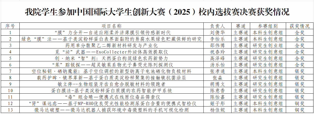 为深入落实习近平总书记小说网 教育的重要论述和习近平总书记给中国国际大学生创新大赛参赛学生代表的回信精神,提升大学生创新创能力、培养大学生创新创业素养,学校于3月至5月成功举办中国国际大学生创新大赛(2025)校内选拔赛。