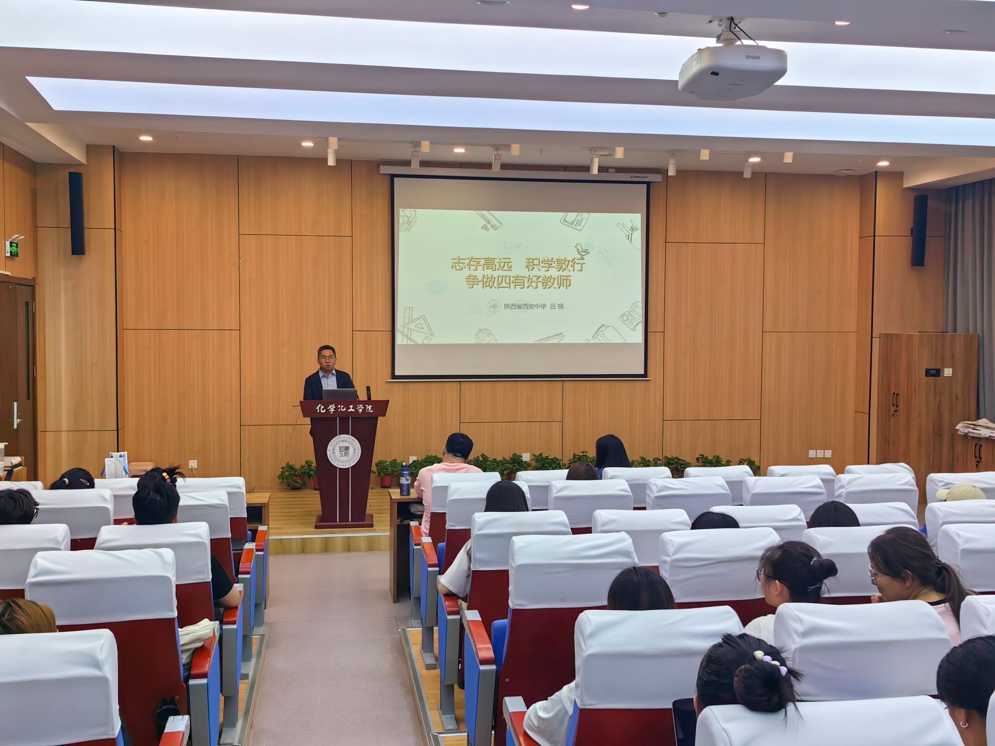邀请陕西省第六批学科带头人、陕西省教学能手、陕西省教育厅优秀共产党员,西安中学教学处主任、化学高级教师、2005届学院毕业生吕铎老师做客化学基础教育名师讲堂,为师范生作《志存高远 积学敦行——争做四有好老师》专题报告。学院100余名师范生参加本次报告会。