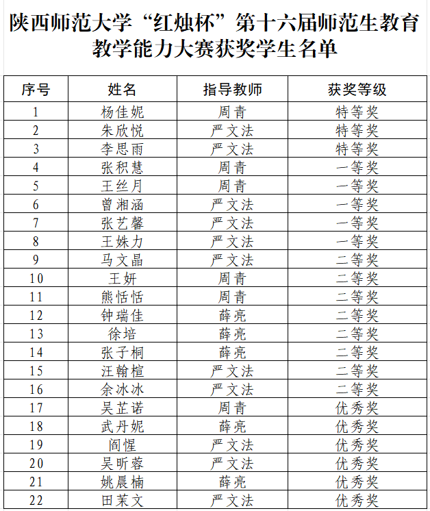 共22名学生在“红烛杯”第十六届师范生教育教学能力大赛中获奖,其中特等奖3人、一等奖5人、二等奖8人、优秀奖6人,获奖数量位居全校第4名。周青教授、严文法教授获评优秀指导教师。