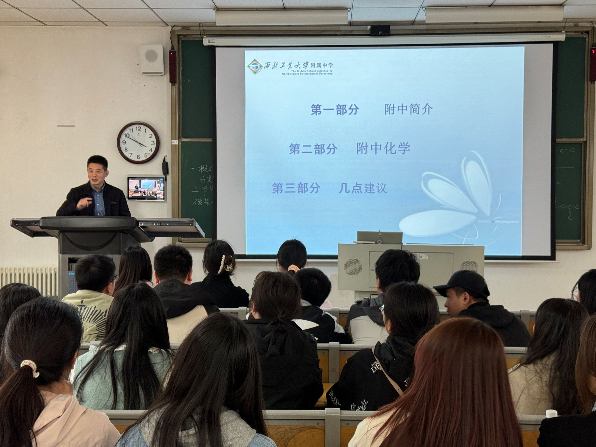 接着,西工大附中教务处夏靖龙主任带领同学们参观了西工大附中校园与化学实验室,并为同学们做了一场“走进西工大附中”的主题报告,介绍了西工大附中的发展概况、教学特点以及附中化学的教学情况,帮助同学们更好地了解中学化学的教学现状以及教学方法。