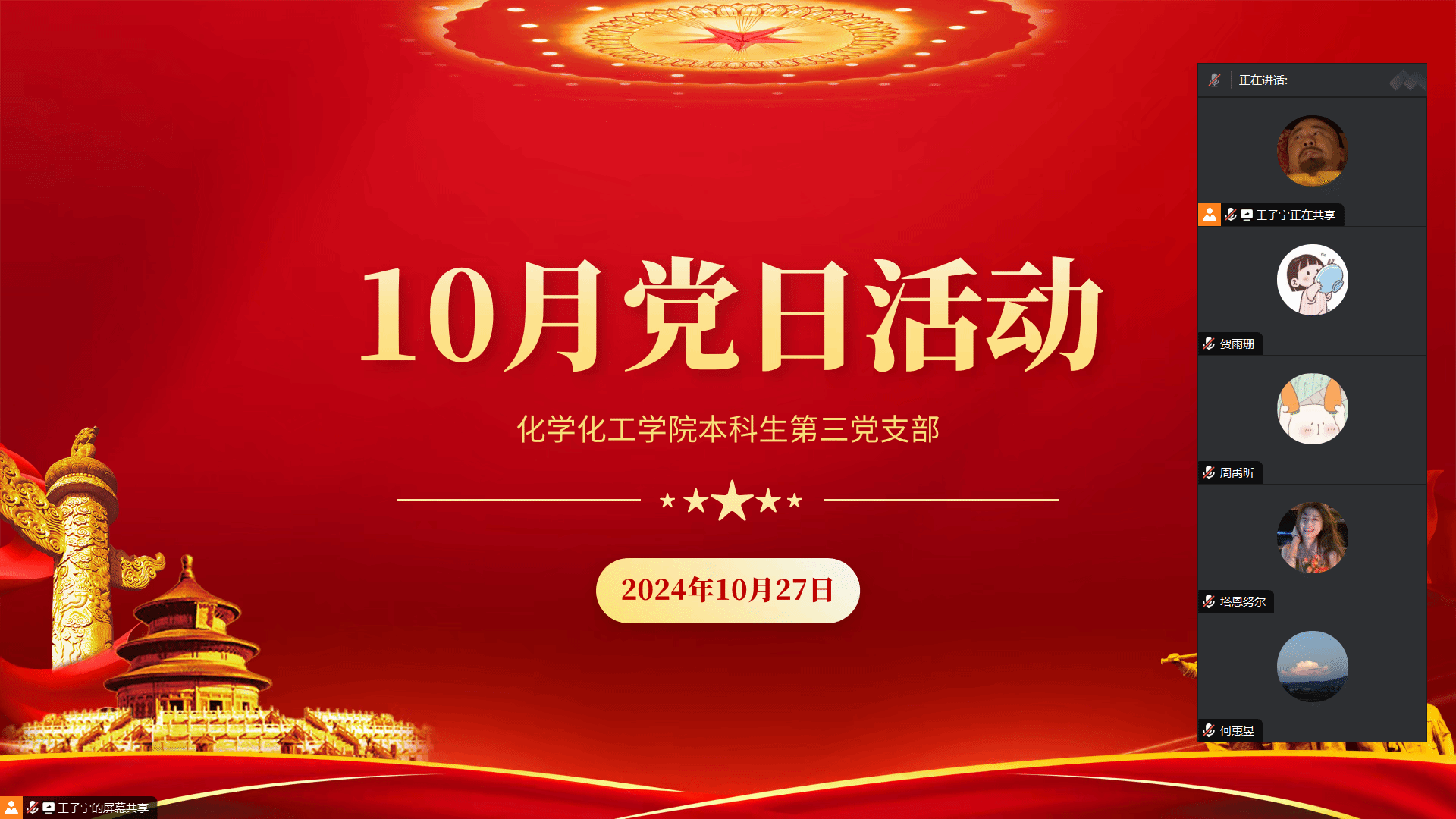 10月20日,研究生化工党支部与研究生有机第一党支部在致知楼1347召开了主题党日活动,会议由梁泓钜和郭成龙两位书记共同主持,支部全体成员参与。支部书记梁泓钜同志表示,风清则气正,气正则学进,在解决科学问题上动脑筋、下功夫,激发源源不断的创新活力,才能为国家实现高水平科技自立自强不断提供有力支撑,才能弘扬中国特有的教育家精神。各位同志纷纷表示要以身作则,坚持践行教育家精神。