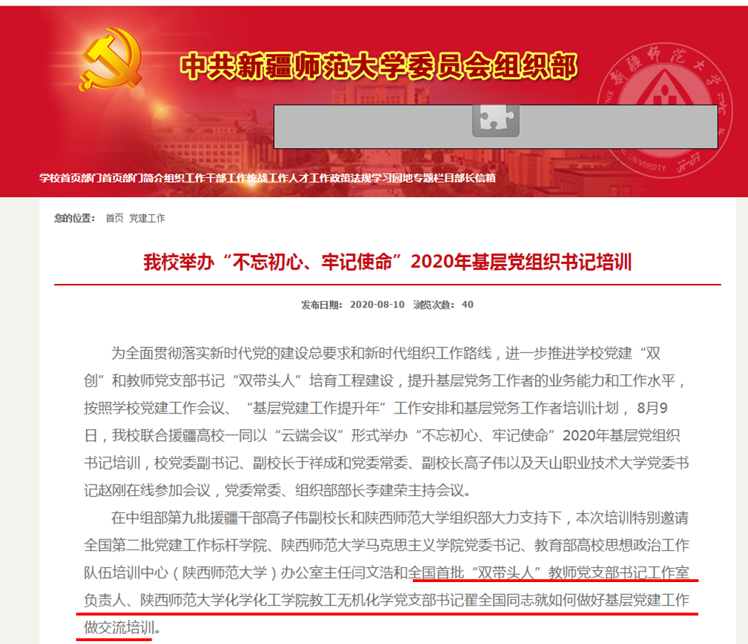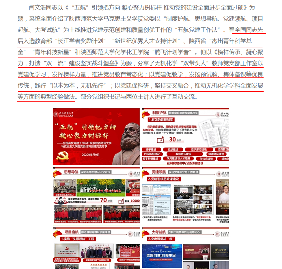 8月9号,应新疆师范大学邀请,教工无机党支部书记翟全国在“新疆师范大学基层党组织书记培训”在线会议上做交流发言,介绍了学院在基层党建工作方面的经验,很好地宣传了教工无机化学党支部。