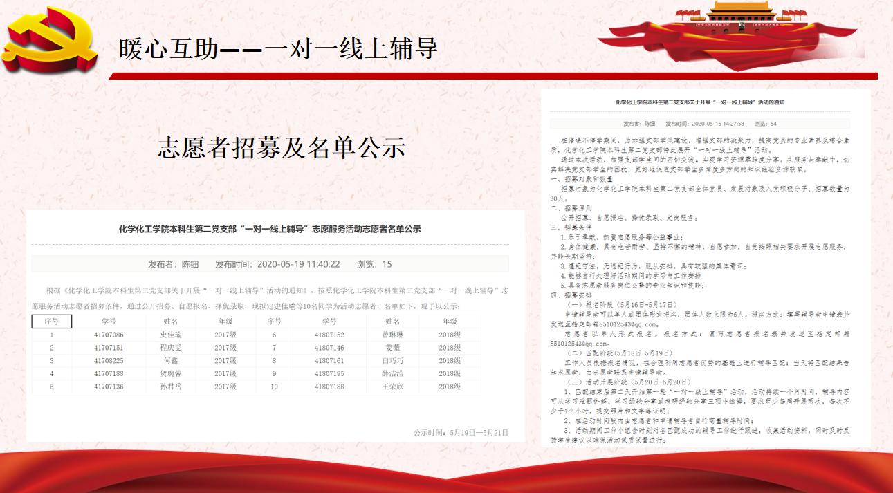 本科生第二党支部在停课不停学期间,组织开展了“暖心互助——一对一线上辅导”志愿服务活动。
