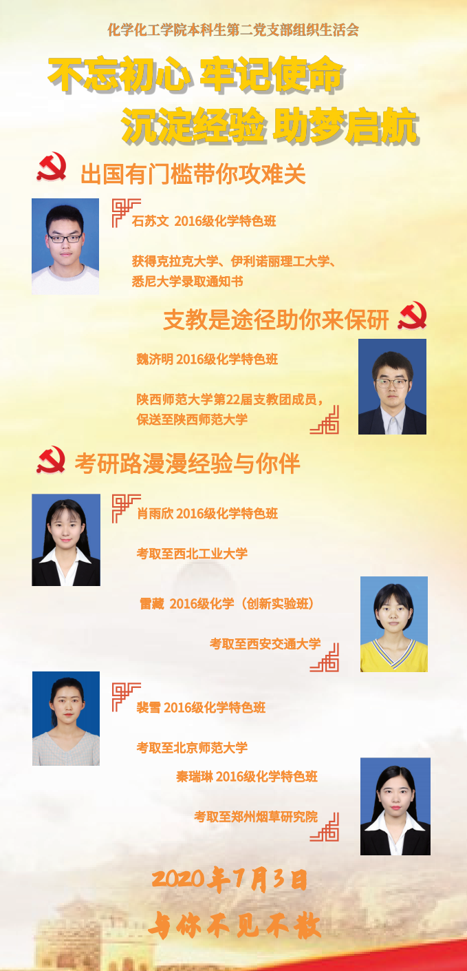 的支部党员魏济明同志分享了自己的支教团保研经历;专题三:考研路漫漫经验与你伴,邀请了支部党员肖雨欣(考取至西北工业大学)、雷藏(考取至西安交通大学)、裴雪(考取至北京师范大学)、秦瑞琳(考取至郑州烟草研究院)分享了考研复习经验。